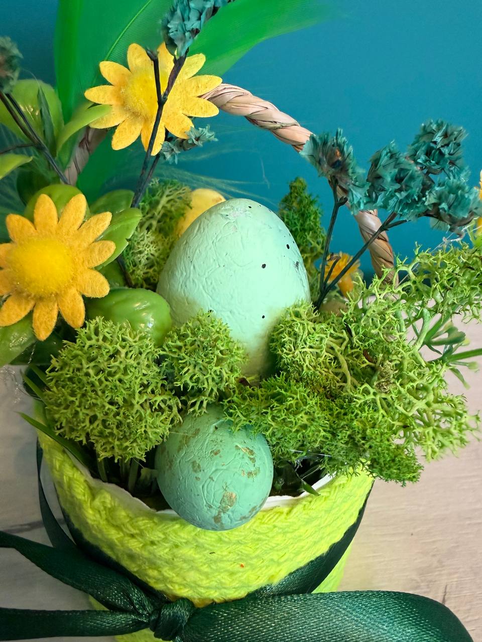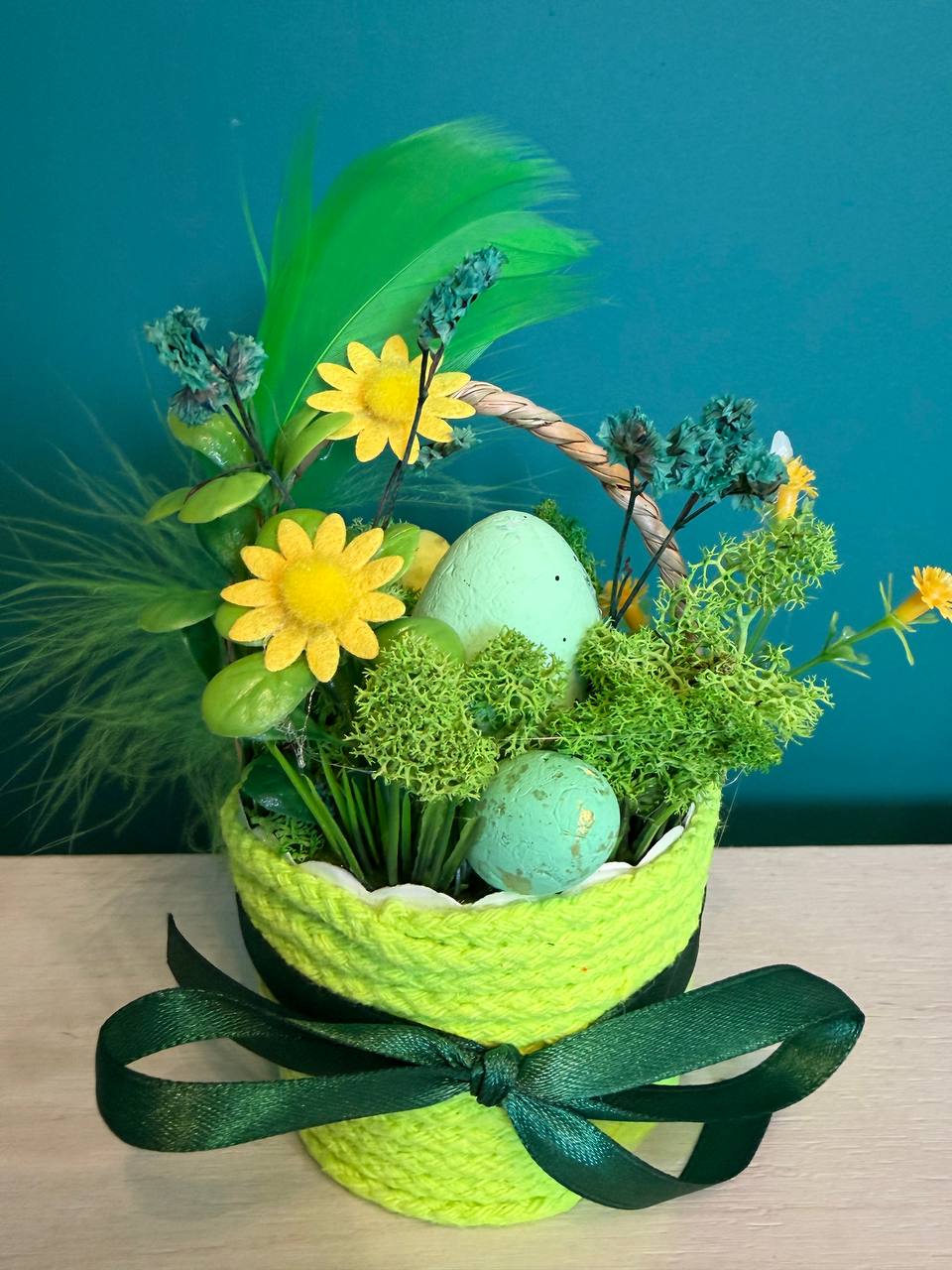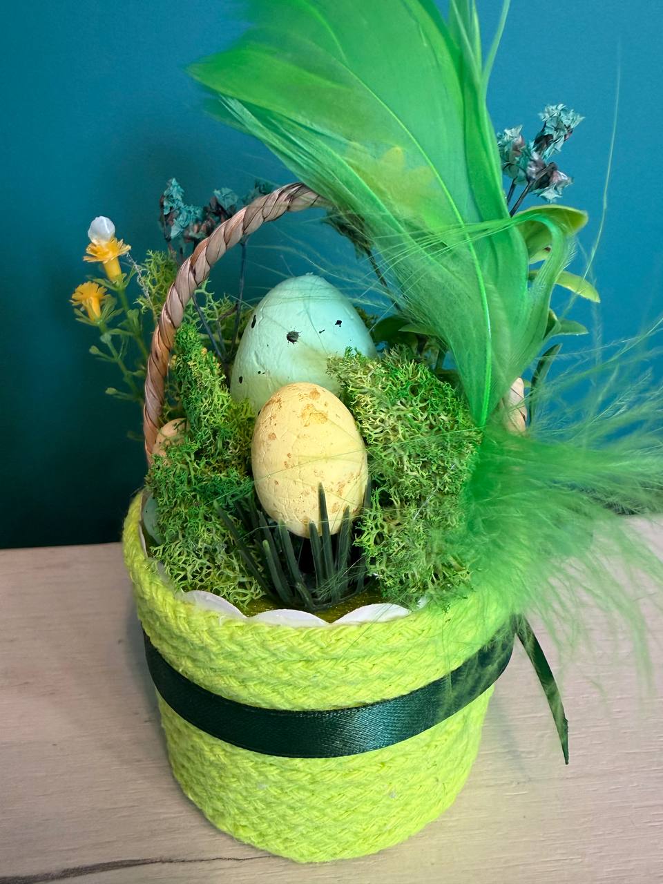 Вариант 1: „Слънчева ливада“ (Лайм и Жълто) – Ярка кошничка в цвят лайм, аранжирана с пастелно зелено яйце, ведри жълти цветчета и ефирни зелени пера.