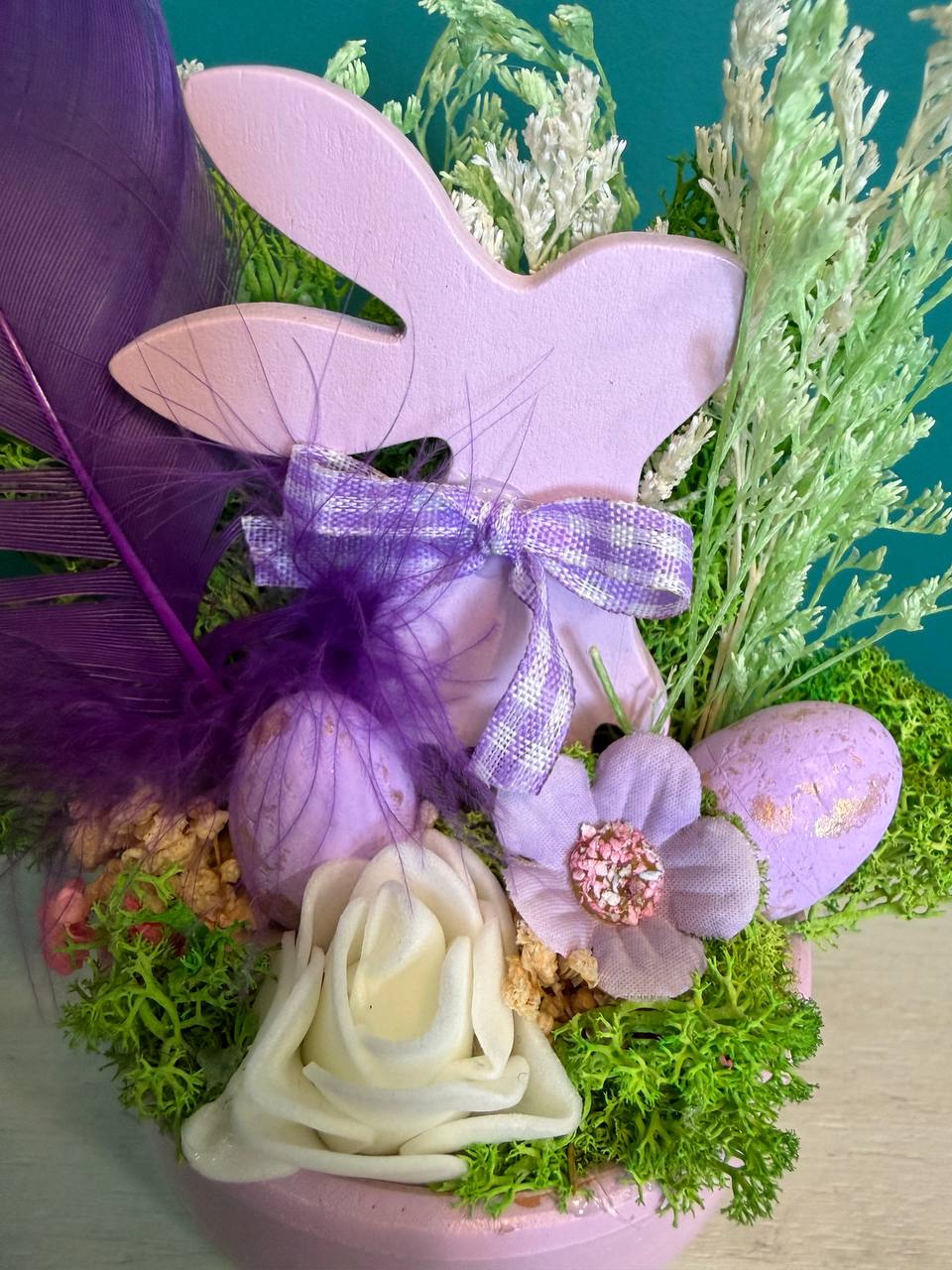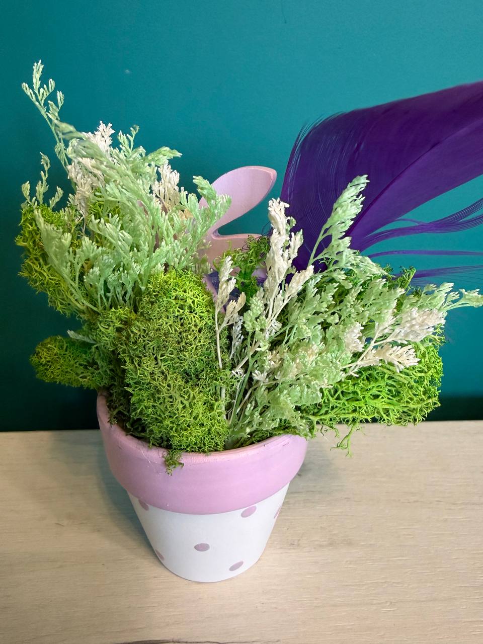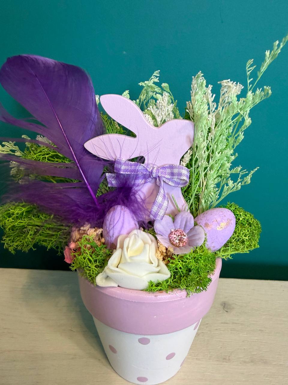 Вариант 2: „Пурпурна мечта“ (Розово и Лилаво) – Деликатна керамична кашпа на розови точки с дървено великденско зайче, лилави пера и нежни розови яйца.