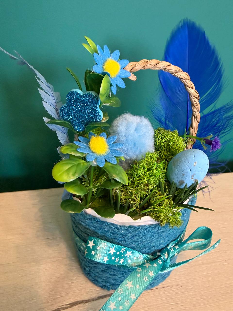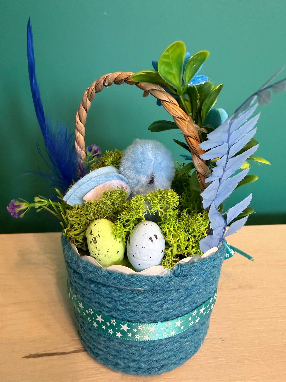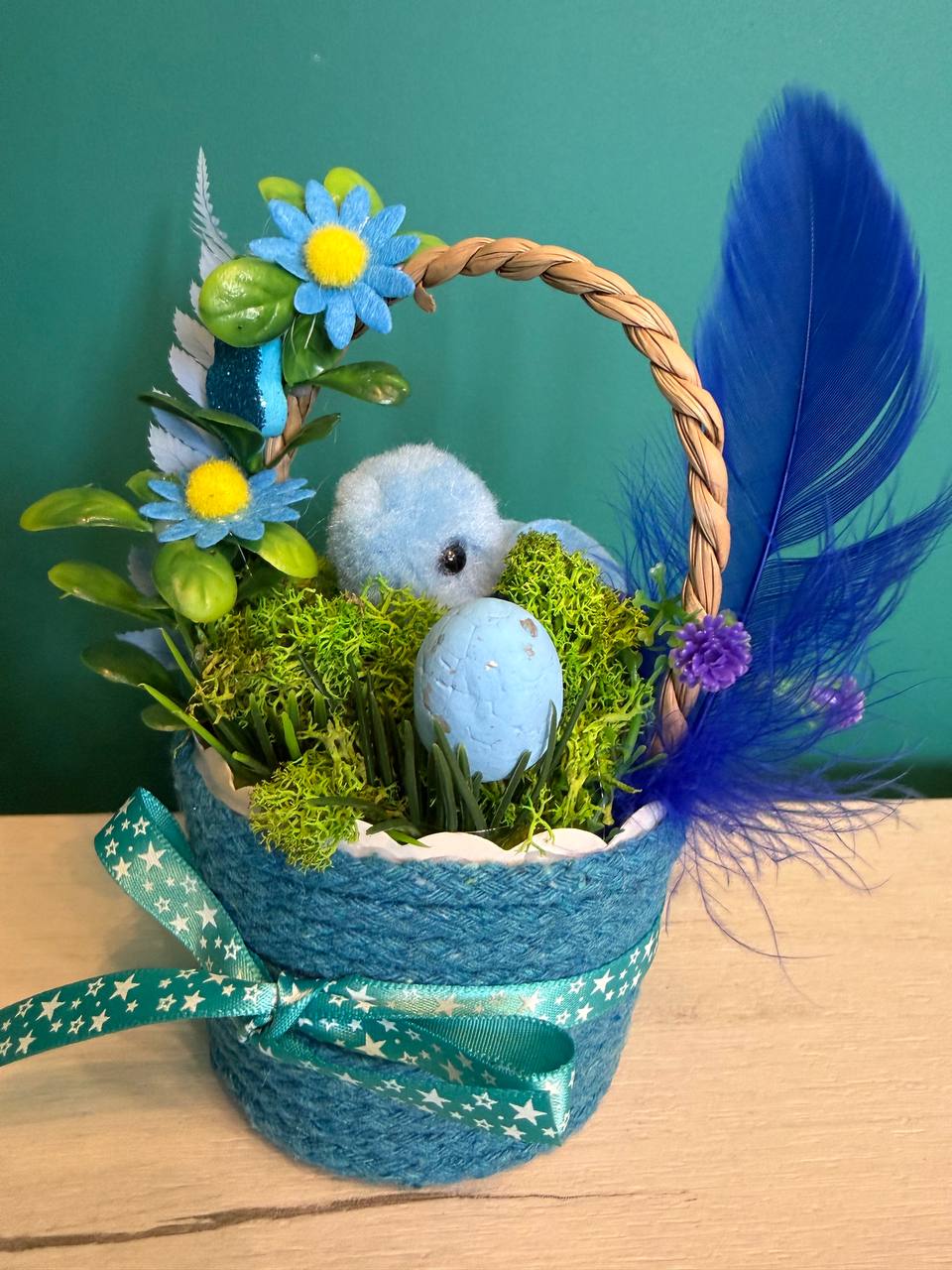 Вариант 3: „Синьо небе“ (Синьо и Тюркоаз) – Стилна синя кошничка с пухкаво синьо пиленце, синьо яйце и деликатни тюркоазени цветя.