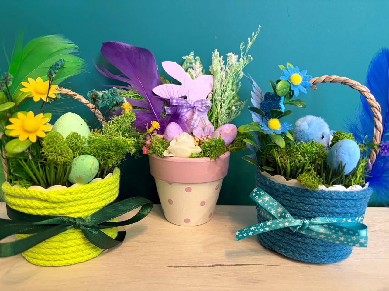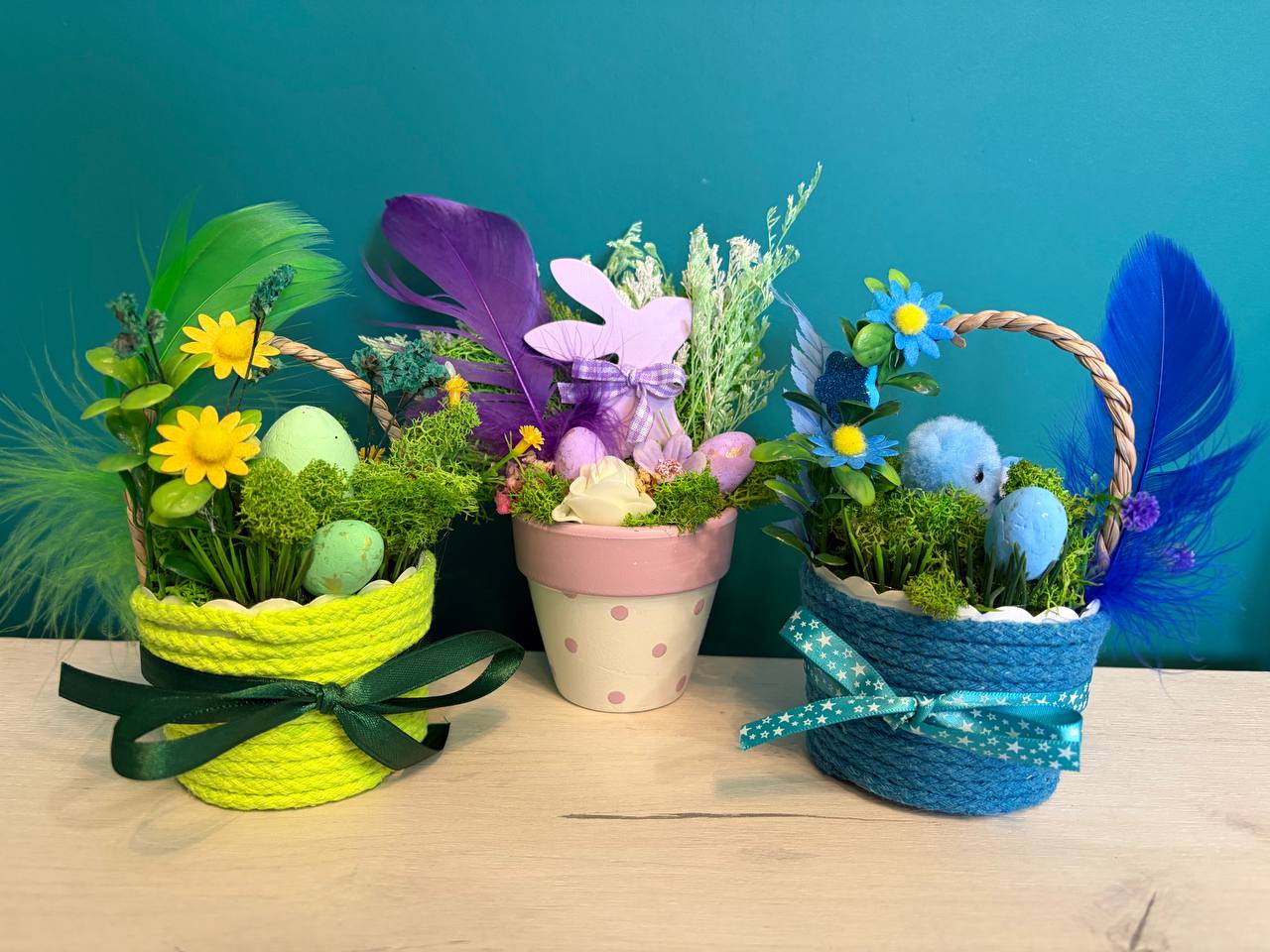 Колекцията предлага три различни цветови свята, за да пасне на всеки интериор. Независимо дали ще изберете свежото лаймово зелено, нежното бебешко розово или спокойното небесно синьо, вие получавате декорация, изработена с внимание към най-малкия детайл. Всяка кошничка или кашпа крие в себе си малка история – от пухкави пиленца и великденски яйца до ефирни пера и нежни цветчета, които сякаш току-що са разцъфнали в пролетната ливада.