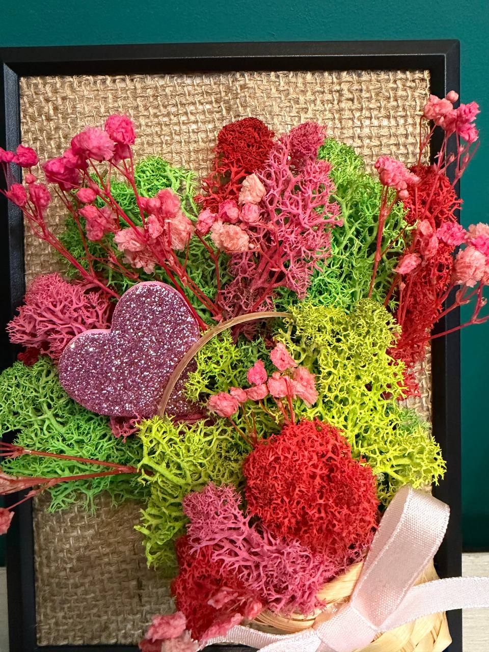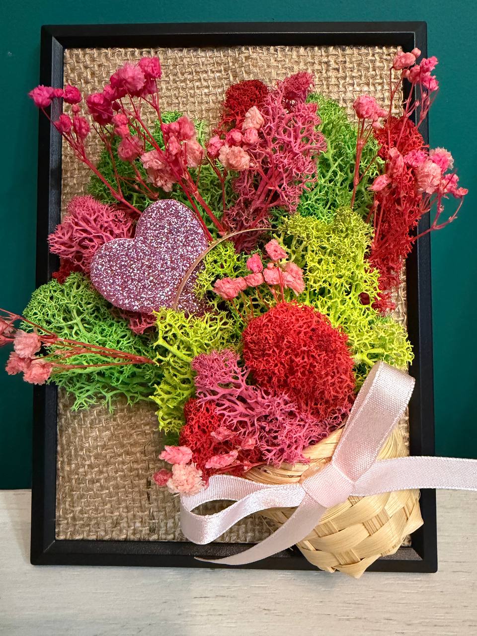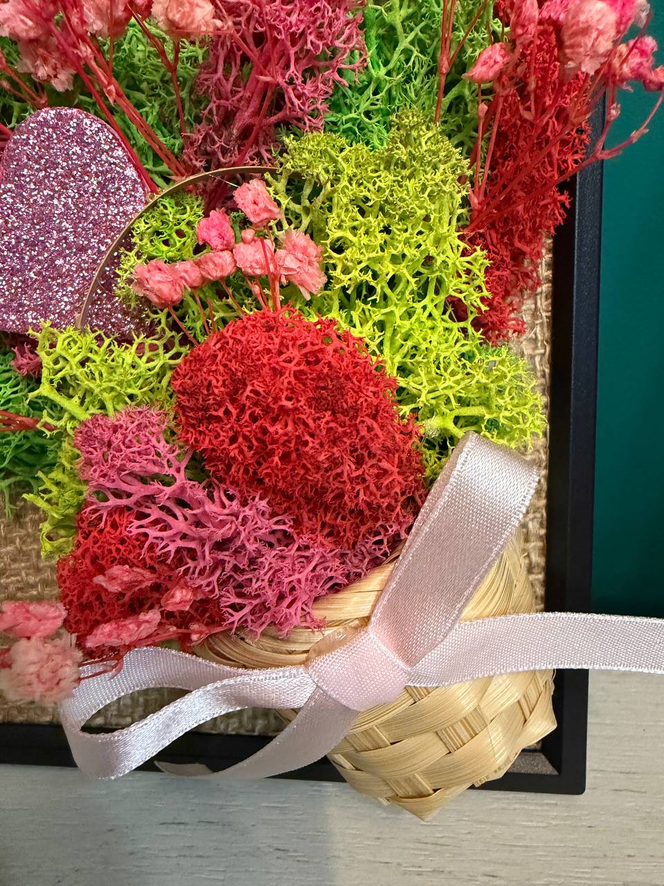 В центърът на композицията е разположена миниатюрна плетена кошничка, от която „избухва“ пищна аранжировка. Използвали сме свеж зелен скандинавски мъх като основа, допълнена от ефирни стръкчета розова гипсофила и акценти от червен мъх. За финал добавихме блестящо розово сърце и нежна панделка, които превръщат картината в послание за обич и внимание.