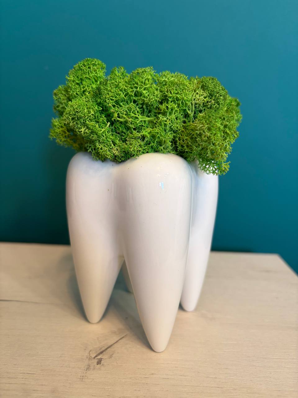 Керамична кашпа Зъб със скандинавски мъх – Декорация за зъболекарски кабинет
